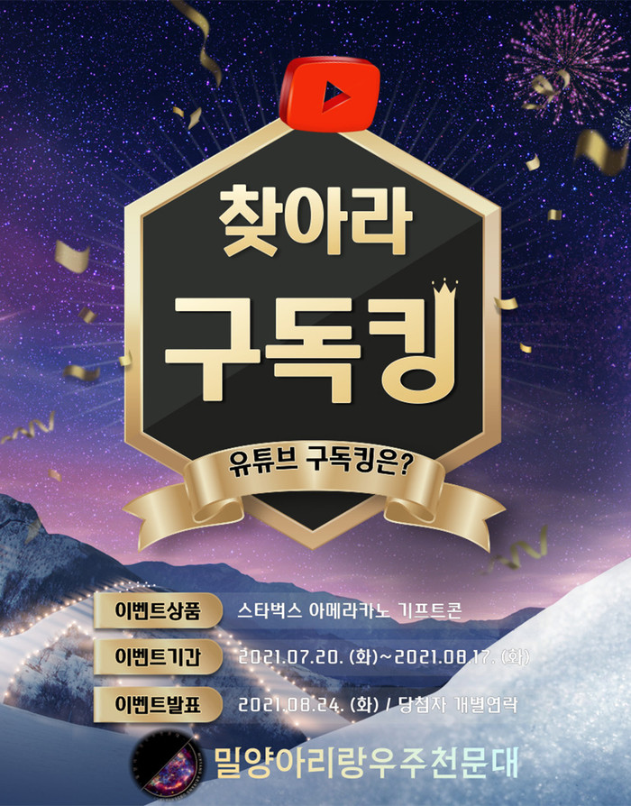 이번 이벤트는 7월 20일부터 8월 17일 사이 밀양아리랑우주천문대 유튜브를 방문하여 구독 및 인증하는 시청자를 대상으로 8월 24일 무작위 50명을 선정, 시원한 아이스커피 기프트콘을 일괄 증정할 예정이다.