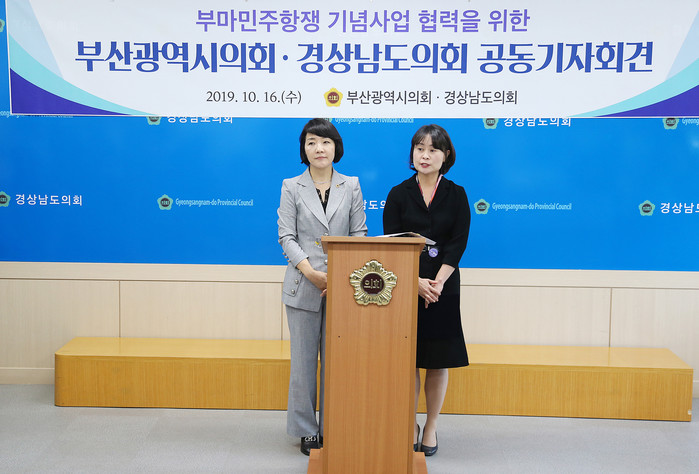 부산시의회(의장 박인영)와 경남도의회(의장 김지수)는 부마민주항쟁 40주년인 16일, 민주정신의 계승과 발전을 위해 「부마민주항쟁 기념에 관한 조례」를 동시에 제정하기로 뜻을 모으고 경남도의회에서 만나 기자회견을 열었다.