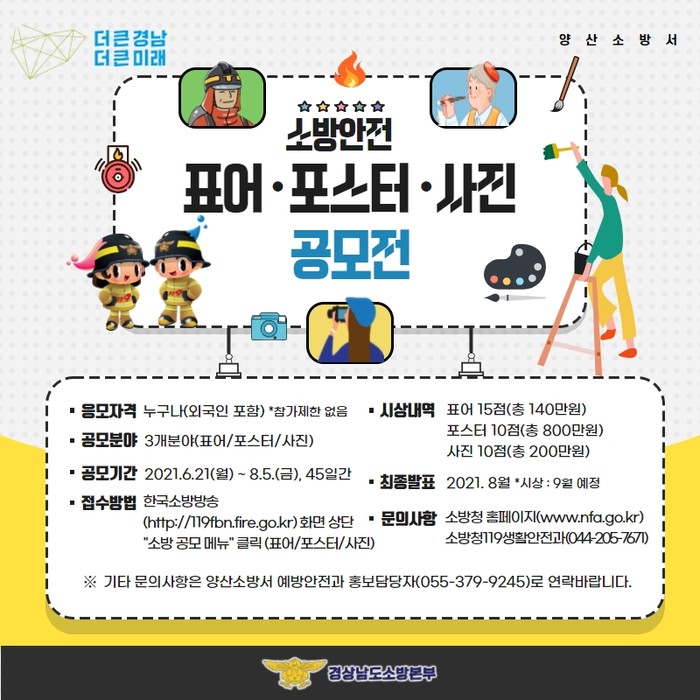 양산소방서(서장 박정미)는 안전에 대한 국민 공감대 형성을 위해 ‘2021년 소방안전 표어ㆍ포스터ㆍ사진 공모전’을 홍보한다고 28일 밝혔다.