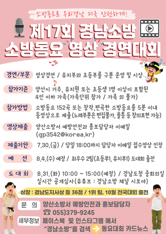 양산소방서(서장 박정미)는 오는 8월 개최될 제17회 경상남도 119소방동요 영상 경연대회 참가자를 모집한다고 밝혔다.