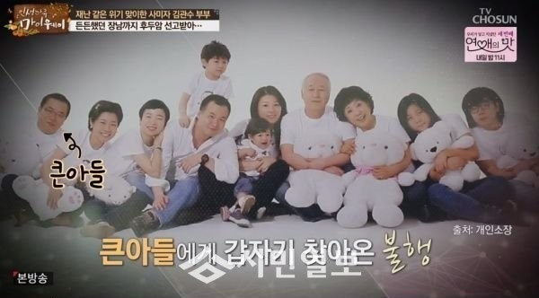 이날 부부는 큰아들에게 갑자기 찾아온 불행을 밝혔다. 김관수는 "아들이 후두암에 걸려서 제일 먼저 가는 줄 알았다. 자식 앞세우는 줄 알 정도로 병원에서 아들을 안 받아주더라. 결국 16시간을 수술했다"고 말했다.