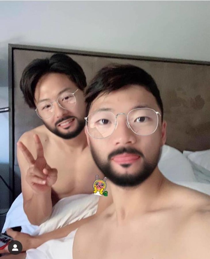 공개된 사진 속 황희찬은 이승우와 함께 상의를 탈의한 채 침대에 앉아 카메라를 쳐다보고 있다.
