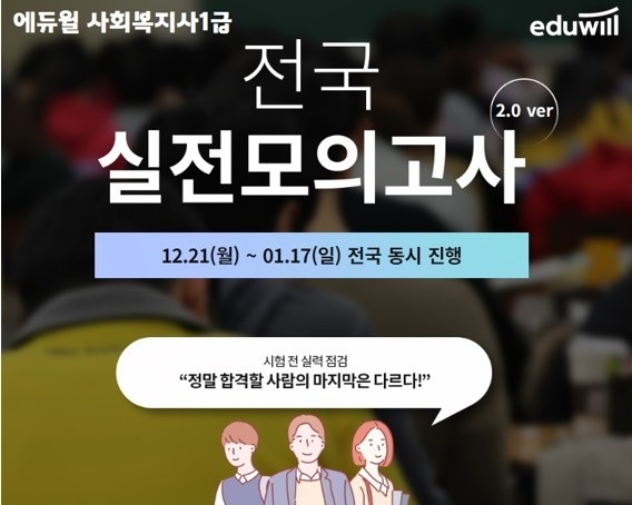 [시민일보 = 여영준 기자] 사회복지사1급 시험에 앞서 마무리 점검을 할 수 있는 종합교육기업 에듀윌(대표 박명규)의 전국 실전모의고사가 오는 17일까지 전국에 동시 진행된다.