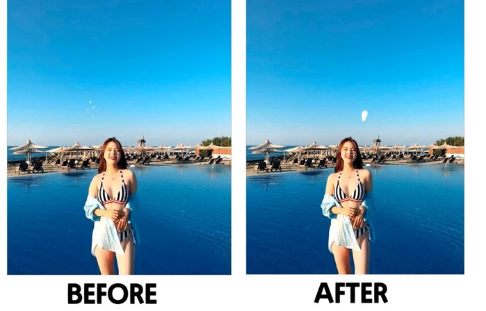 하늘은 포토샵 어플을 이용해 "어깨와 튀어나온 살들을 배경에 방향에 맞게 쓸어줘야한다. 승모근을 줄이고 목을 얇게 뺴주고 팔둑을 줄여준다. 다리의 틈을 벌어지게 공략해야한다. 그래야 말라보인다"고 알렸다.