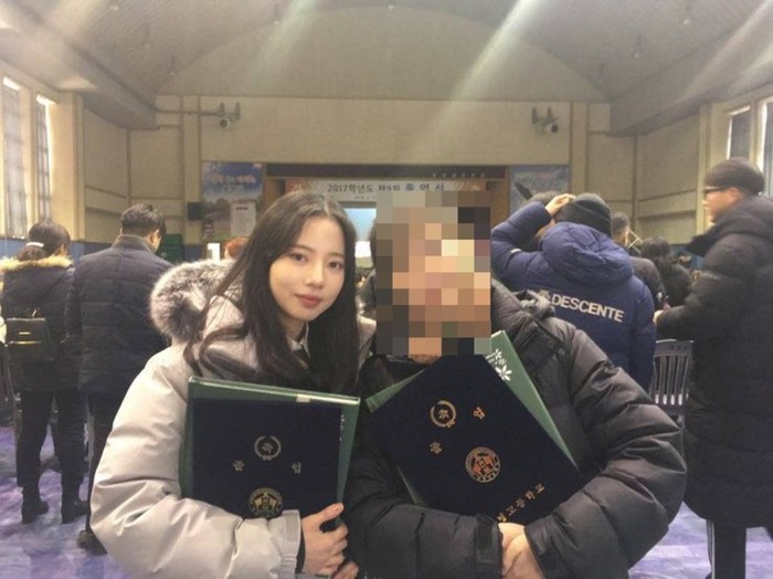 공개된 사진 속 송유진은 학교에서 친구와 함께 졸업장을 들고 카메라를 쳐다보는 모습이다.