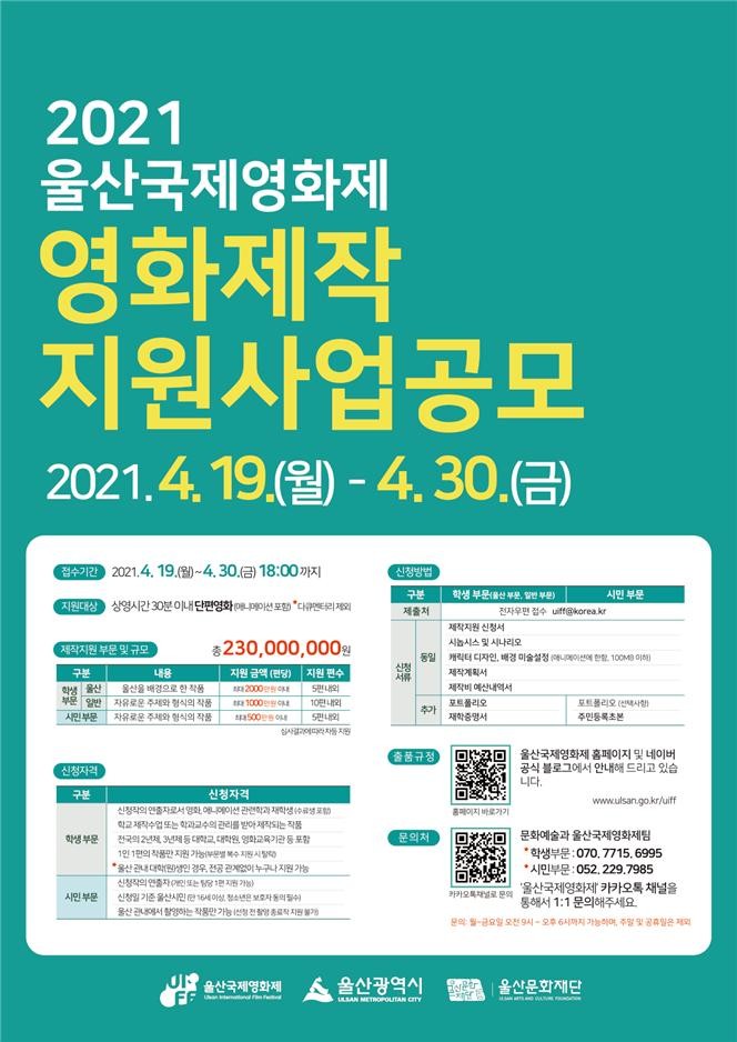 사업 공모에 대한 기타 자세한 사항은 누리집을 참고하거나 전화 또는 카카오톡 채널의 ‘울산국제영화제’로 문의하면 된다.