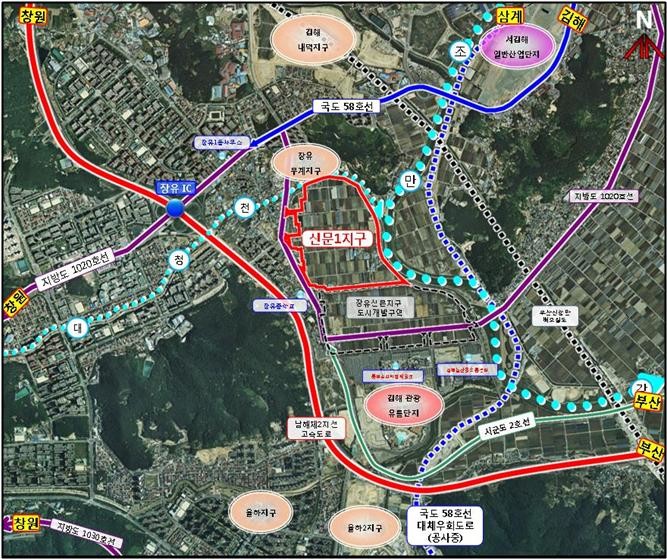 신문1지구 도시개발사업은 장유신문지구 도시개발사업과 연계해 개발계획을 수립했으며 2923세대(7893명)의 인구 수용을 위해 단독·공동주택을 조성하고 도로, 주차장, 공원, 학교, 유수지 등 도시기반시설을 법적기준 대비 초과 설치해 쾌적한 주거환경을 조성한다.