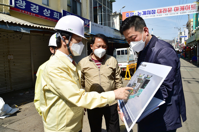 진주시 원 도심에 위치한 중앙시장과 논개시장의 오랜 숙원사업인 ‘대관문 아케이드 사업’이 3월 25일 노후 시설물 철거작업을 시작으로 본격 착공되었다.