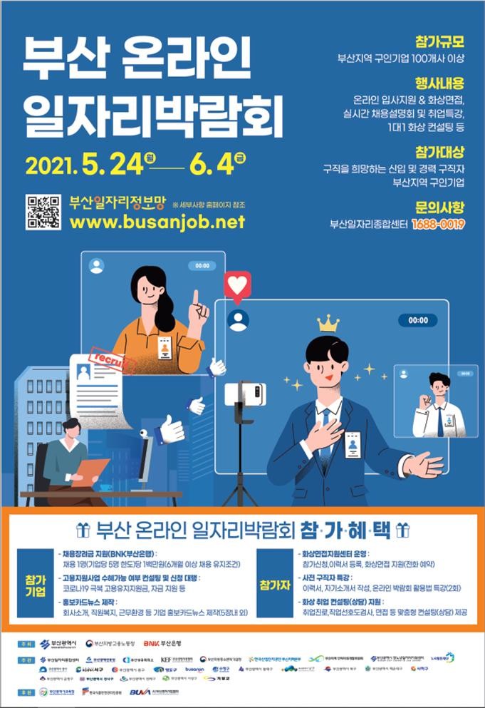 부산시(시장 박형준)는 코로나19 시대, 지역 고용시장 활성화를 위해 부산지방고용노동청, BNK부산은행과 함께 5월 24일부터 6월 4일까지 2주간「2021년 부산 온라인 일자리 박람회」를 개최한다고 밝혔다.
