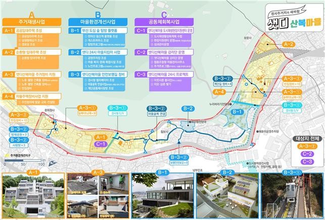 부산시는 앞으로 ❶주거재생사업을 통해 ▲공기업 중심의 경사지 순응형 주거공간인 테라스형 공공임대주택 ▲순환형 임대주택 ▲집수리 지원 ▲자율주택정비 지원을 추진하며 ❷마을환경개선사업으로 ▲지역특성을 반영한 거점 공간인 부산 도심 숲 탐방 플랫폼 조성 ▲샛디 24시 마을지킴이 사업 ▲보행 안전성 강화 및 마을 기반시설 개선을 위해 마을 내 보행길 정비 사업 등을 추진한다. 이어 ❸공동체회복사업으로는 ▲주민 교육을 통한 지속가능한 커뮤니티 활성화 ▲마을관리조직 발굴·육성을 통한 지속성 유지를 위해 현장지원센터 운영 ▲샛디마을 감리단 운영 ▲24시 프로젝트 등을 시행한다는 계획이다.