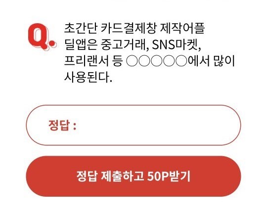 딜앱결제창 오전 7시 퀴즈는 "초간단 카드겨제창 제작어플 딜앱은 중고거래, SNS마켓, 프리랜서 등 ○○○○○에서 많이 사용된다"로 문장 속 공란에 들어가는 단어를 입력하면 된다.
