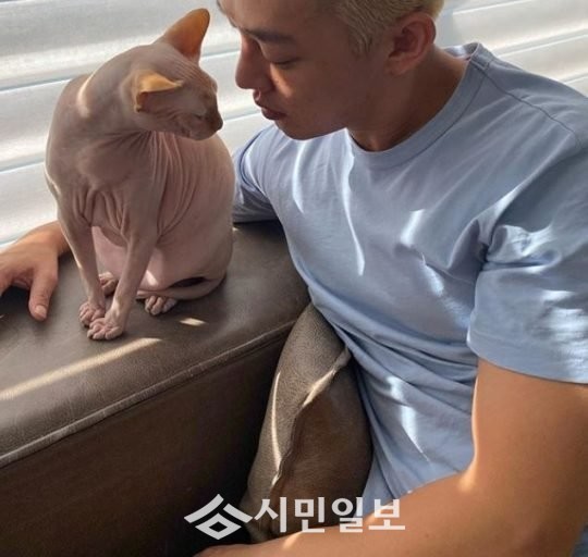 반려묘와 다정하게 눈을 맞추고 있는 그의 모습이 인상적이다.