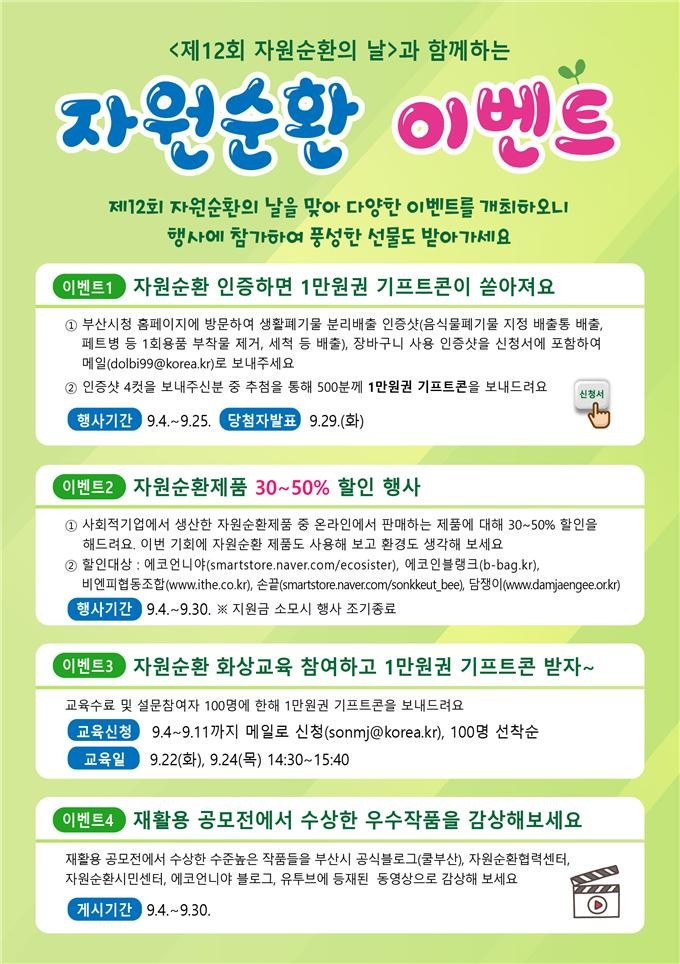 ‘자원순환 인증 이벤트’는 장바구니 사용이나, 생활폐기물 분리배출 사진을 서식에 작성하여 전자우편(dolbi99@korea.kr)으로 보내면 무작위 추첨을 통해 500명에게 1만 원권 기프티콘을 제공한다. 행사 기간은 9월 4일부터 25일까지 22일간이며, 당첨자는 9월 29일 부산시 홈페이지를 통해 발표할 예정이다.