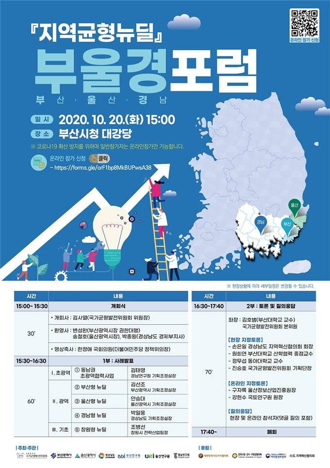 부산시(시장 권한대행 변성완)는 10월 20일 오후 3시, 부산시청 1층 대강당에서 국가균형발전위원회, 울산광역시, 경상남도와 공동으로 ‘지역균형뉴딜 부울경포럼’을 개최한다고 밝혔다.