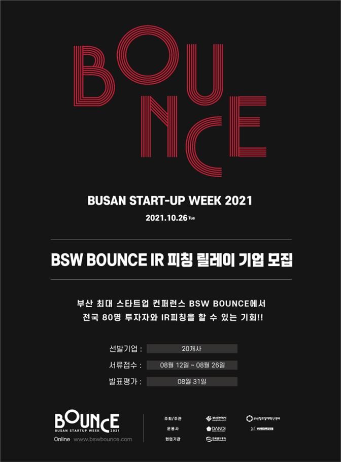 ‘BSW BOUNCE 2021’은 오는 10월 26일부터 30일까지 파라다이스호텔에서 개최 예정이며, 기업설명(IR) 릴레이는 26일 같은 장소에서 개최된다. 올해 행사는 특별히 한국모태펀드 운용사인 한국벤처투자와 협업하여 진행하며, 온·오프라인을 통해 전국 투자사 80명 이상이 참여할 예정이다.