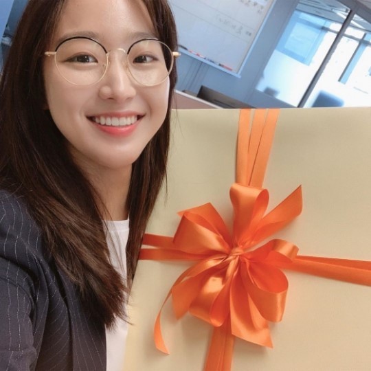 사진 속에는 주시은이 메이크업을 하지 않고 안경을 쓴 채 선물을 들고 환하게 웃고 있다.