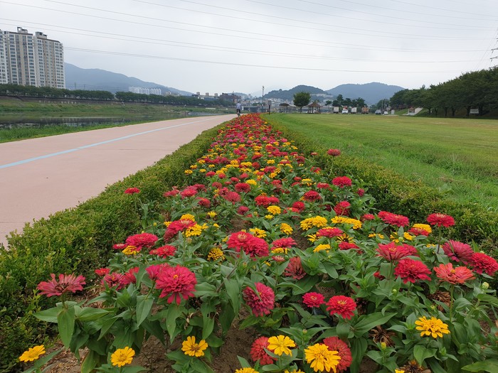 밀양강 둔치 내 산책로변 폭1.5m, 길이256m 화단에 형형색색으로 만개한 백일홍이 아름다움을 뽐내며 산책하는 시민들을 맞이하고 있다.