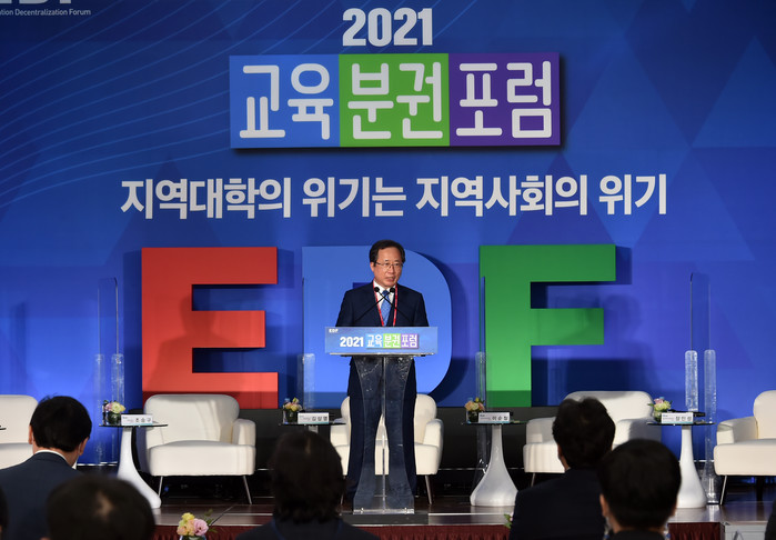 김석준 부산광역시교육감이 지난 17일 오후 2시 해운대구 부산벡스코 컨벤션홀에서 열린‘2021 교육분권포럼’에서 발제를 통해 “지역인재 육성의 메카인 지역대학이 살아야 부산이 살 수 있다”고 밝혔다.