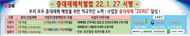 김해에서는 지난 3월 17일 삼정동 모 병원 증축공사 현장에서 22m 아래로 추락한 근로자 1명이 숨진데 이어 7월 23일 진례면 한 공장 신축공사 현장에서 8m 아래로 추락한 근로자 1명이 숨지는 등 고귀한 생명이 산업재해로 사라지는 안타까운 상황이 잇따라 발생하여 시는 법 시행 전이지만 중대재해 예방을 위한 다각적인 노력을 기울이고 있다.