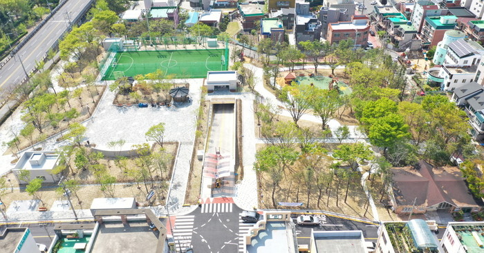 지상 화봉공원은 야외무대, 인조잔디 풋살구장과 어린이 놀이시설, 야외운동시설, 의자와 정자, 산책로 등을 설치해 쾌적한 주민 휴식공간으로 재탄생했다.