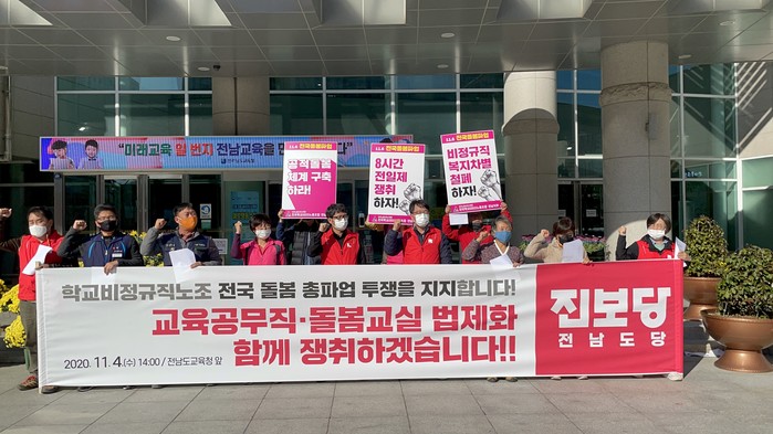 진보당 전남도당 김환석 위원장은 기자회견을 통해 “학교현장에는 비정규직 노동자가 40%를 차지한다”며 “이들은 법적인 신분이 보장되지 않아 학교에서는 ‘유령’같은 존재였다”며 “오는 6일 전국학교비정규직노조 전국 돌봄노동자 총파업은 교육공무직 법제화와 돌봄 공공성 강화와 확대, 돌봄 노동자들의 신분보장과 처우개선을 위한 정당한 파업이며 진보당은 학교비정규직 노동자들의 투쟁을 지지하고 함께 하겠다”고 밝혔다.