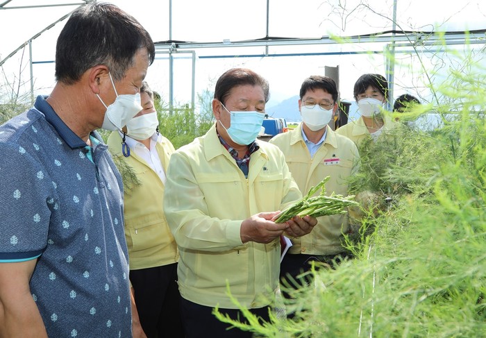 | ▲ 조근제 군수(가운데)가 아스파라거스 농장을 방문해 현장을 둘러보는 모습. (사진제공=함안군청) |