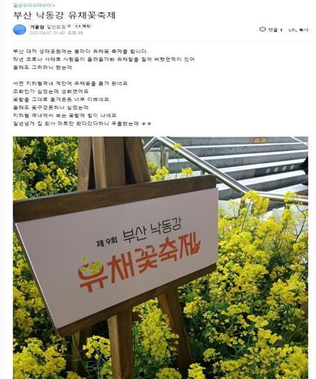 한편, 부산시(시장 박형준)는 최근 4월 한달간, 낙동강유채꽃 축제를 비대면·온라인 방식으로 성공적으로 마무리하였다.