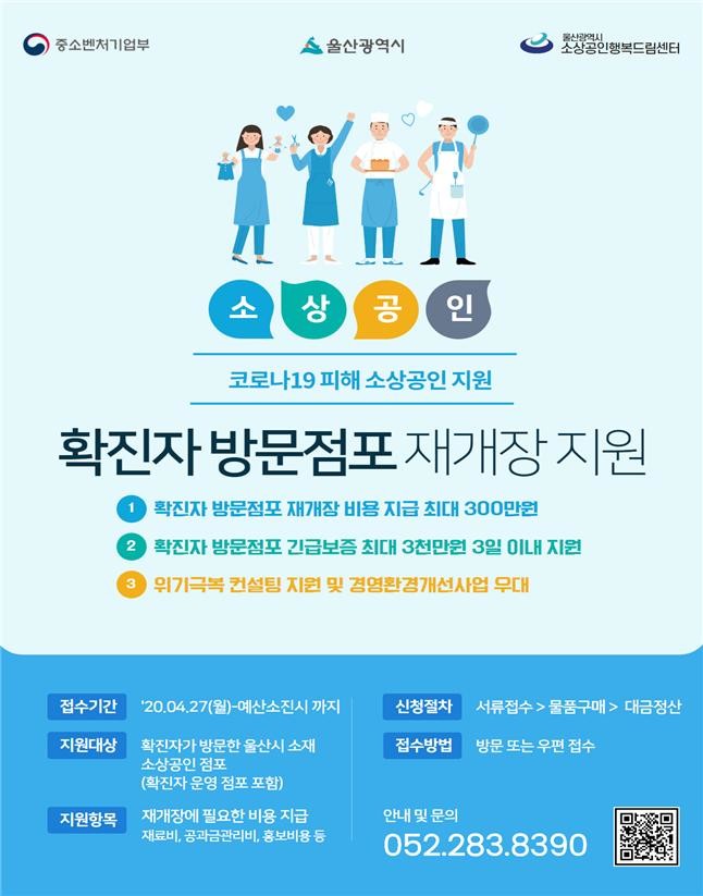 울산시는 ‘울산광역시소상공인행복드림센터’주관으로 코로나19 확진자 방문으로 경영에 어려움을 겪은 소상공인 점포를 위해 정부사업인 ‘코로나19 확진자 방문 점포 재개장 지원사업’을 실시한다고 밝혔다.