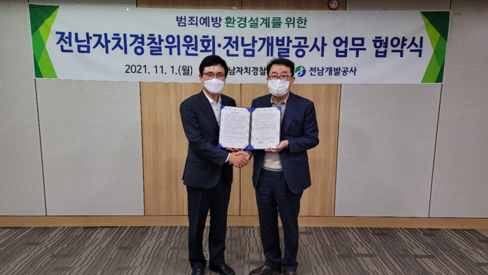 전라남도자치경찰위원회와 전남개발공사는 11월 1일 전남개발공사 회의실에서 기관간의 협력을 통해 지역사회의 안전한 생활환경 등 지역 내 범죄.교통사고예방 환경 조성을 위한 업무협약을 체결했다.