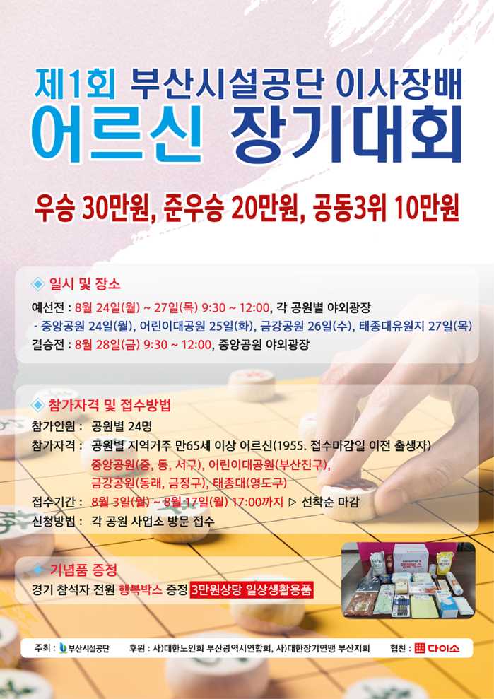 부산시설공단(이사장 추연길)은 코로나19의 장기화로 야외 활동을 하지 못했던 지역 어르신들의 건강증진과 건전한 여가문화 보급으로 노후생활 활력을 높이고자 「제1회 부산시설공단 이사장배 장기대회」를 개최한다고 밝혔다.