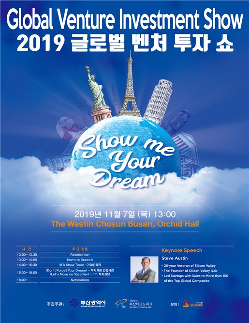 부산시(시장 오거돈)는 ‘아시아 제1의 창업도시, 부산’이라는 비전 아래, 혁신의 가치와 창업의 열기를 글로벌로 전파하기 위해 11월 7일 웨스틴조선호텔 부산 2층 오키드홀에서 ‘2019 글로벌 벤처 투자쇼 - Show Me Your dream’을 개최한다.