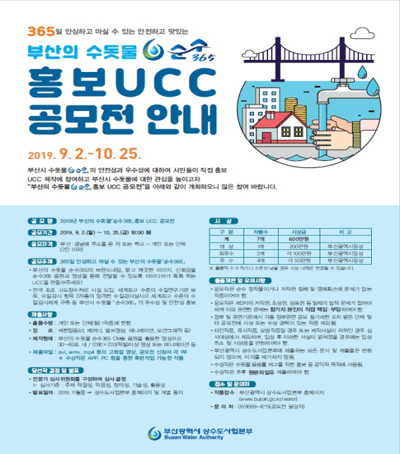 부산시 상수도사업본부(본부장 이근희)는 9월 2일부터 10월 25일까지 ‘부산의 수돗물 「순수365」홍보 유씨씨(UCC, user created contents) 공모전’을개최한다고 밝혔다.