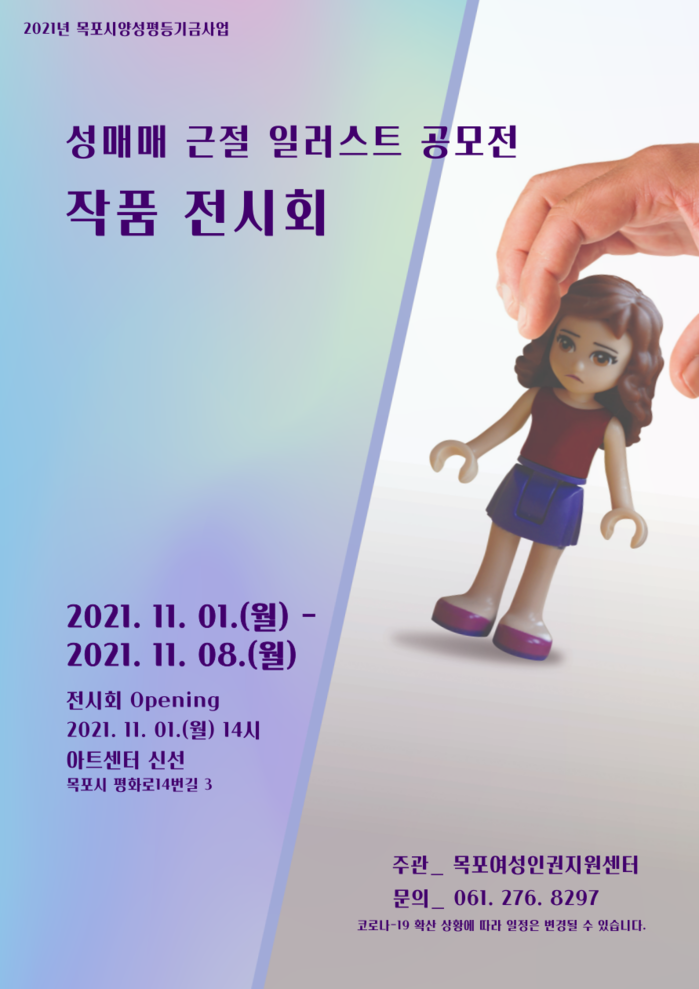 이날 공모전은 11월 1일(월) ~ 11월 8일(월)까지 8일간의 일정으로 아트센터 신선에서 ‘성매매 근절 일러스트 작품 전시회’를 마련한다.