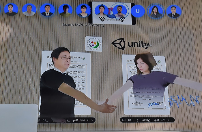 이날 협약식은 코로나19 상황을 감안해 가상현실을 활용해 진행했다. 이날 김석준 교육감은 부산에서, 김인숙 유니티코리아 대표는 서울에서 AR 협업플랫폼 스페이셜(Spatial)앱을 활용해 홀로그램 아바타가 공존하는 가상현실세계에서 협약을 체결했다.