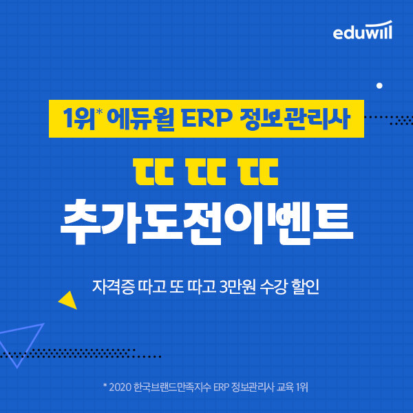 [시민일보 = 여영준 기자] 종합교육기업 에듀윌(대표 박명규) ERP정보관리사는 세무회계 관련 자격증을 준비하는 수험생을 위해 ‘추가 도전’ 이벤트를 진행한다고 밝혔다.