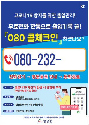 군은 관내 음식점, 목욕장업, 이·미용업, 종교시설 등 설치를 희망하는 모든 다중이용시설에 안심콜 출입관리 서비스를 지원하며 포스터와 안내용 스티커도 배부할 계획이다.