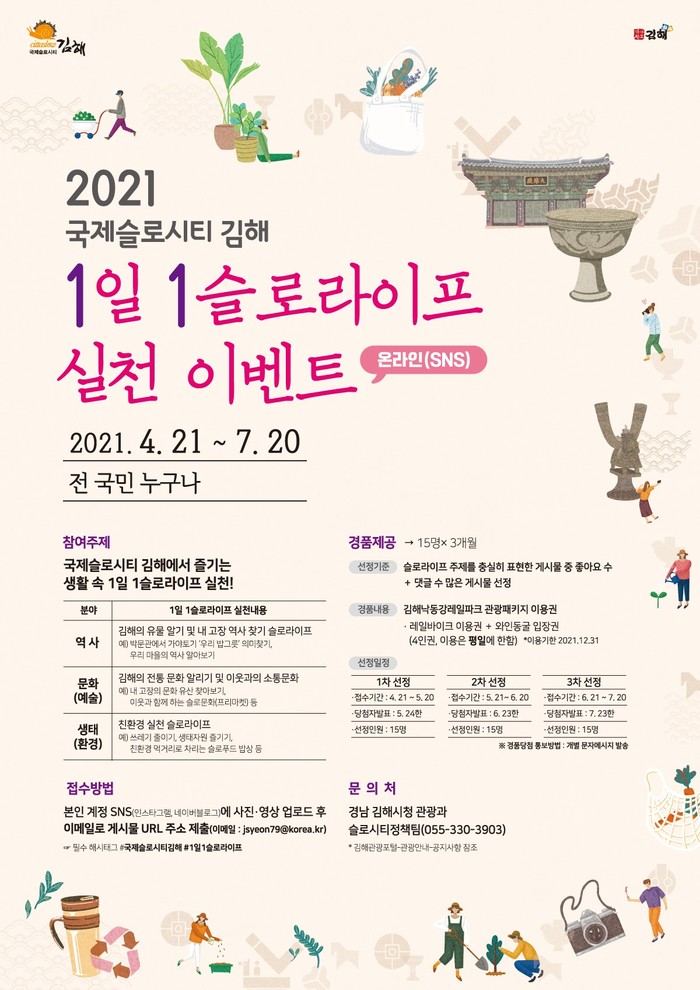 김해시는「국제슬로시티 김해」를 대내외적으로 알리고, 슬로시티 운동 동참과 확산을 위하여 4월 21일부터 7월 20일까지 ‘2021년「국제슬로시티 김해」온라인(SNS) 1일 1슬로라이프 실천 이벤트’를 개최한다고 밝혔다.