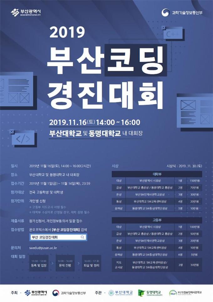 부산시(시장 오거돈)는 소프트웨어(SW) 중심대학인 부산대, 동명대 및 부산형 소프트웨어(SW) 인재사관학교 동명대, 동의대, 신라대와 함께 11월 16일 오후 2시 부산대 및 동명대에서 ‘2019 부산 코딩경진대회’를 개최한다고 밝혔다.