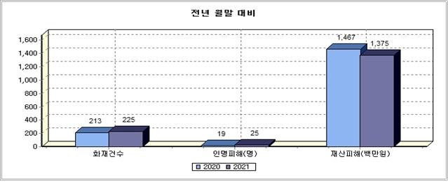 통계자료에 따르면 1분기 화재건수는 225건으로 지난해 213건 보다 12건(5.6%), 인명피해는 25명(사망 2, 부상 23)으로 지난해 19명(사망 3, 부상 16)보다 6명(31.6%)이 증가했다.