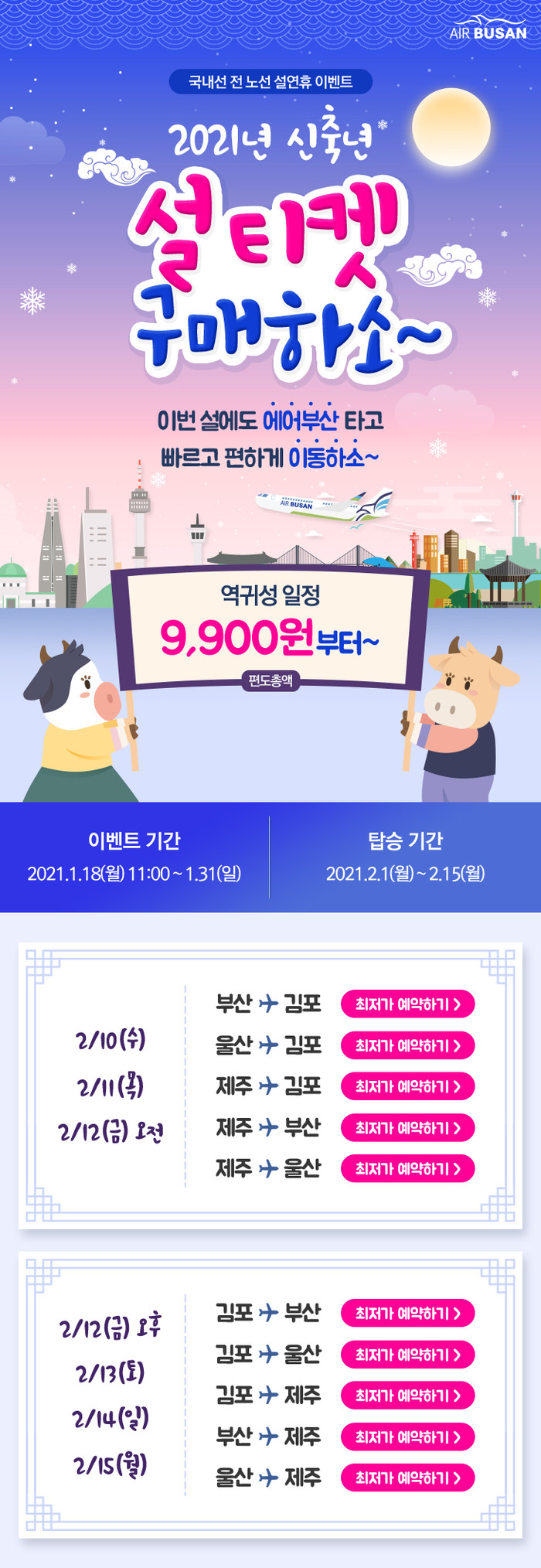 에어부산은 설 연휴 기간인 2월 10일부터 15일까지 △김포↔부산 18편, △김포↔울산 6편 △김포↔제주 12편 △부산↔제주 6편 △울산↔제주 6편 등 5개 노선에 총 48편의 임시 항공편을 운항하고 총 8,910석의 좌석을 추가 공급한다.
