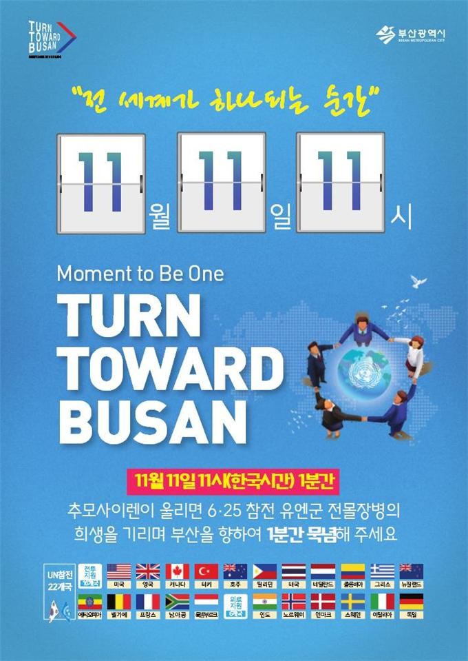 부산시(시장 오거돈)는 부산 유엔기념공원을 향한 전 세계의 동시 묵념 및 추모 행사인 「턴투워드 부산」 국제추모식을 국가보훈처와 함께 11월 11일 오전 11시 UN기념공원에서 개최한다고 밝혔다.