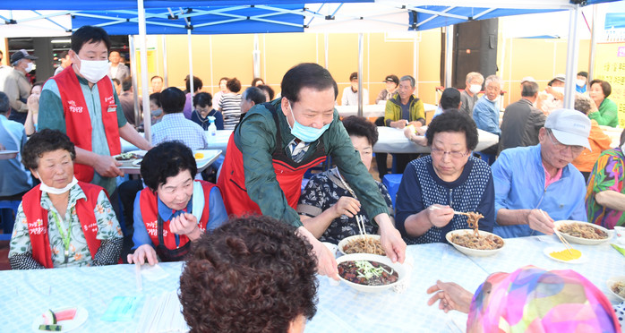행사에 참석한 구인모 군수는 자원봉사자들을 격려하고, 직접 자장면을 배식하며 군민들에게 건강과 안부를 묻는 등 소통의 시간을 가졌다.