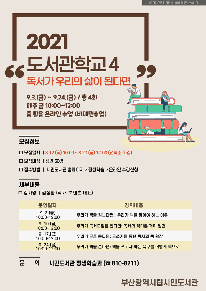 ‘독서가 우리의 삶이 된다면’은 9월 3일부터 4회에 걸쳐 매주 금요일 오전 10시 줌(ZOOM)을 활용해 진행한다.