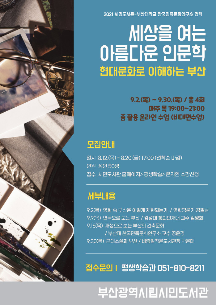 이 특강에 부산대학교 한국민족문화연구소 강사들이‘현대문화로 이해하는 부산’을 주제로 영화, 연극, 건축, 문학 등 다양한 매체로 보는 부산 인문자산의 영향력과 장소 등에 대해 강의한다.