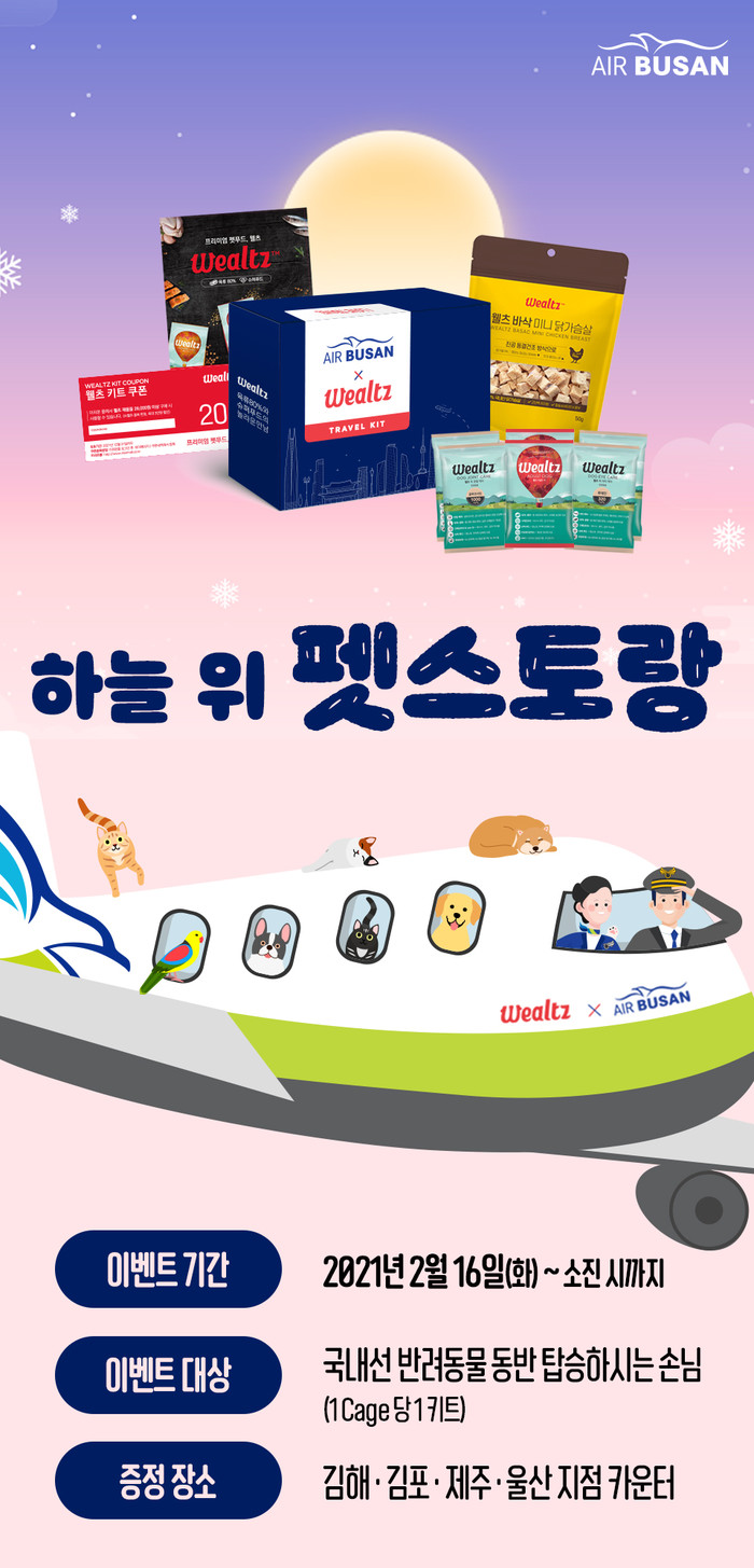 에어부산은 16일부터 국내선 이용 시 반려동물과 함께 탑승하는 모든 승객에게 고품질의 반려동물 사료 및 간식으로 구성된 ‘웰츠(펫 푸드) 트래블 키트’와 ‘반려동물 전용 탑승권’을 증정할 계획이다. ‘웰츠(펫 푸드) 트래블 키트’는 김해·김포·제주·울산 지점 카운터에서 수령할 수 있으며, ‘반려동물 전용 탑승권’은 탑승수속 시 카운터에 요청하면 발급받을 수 있다. 해당 이벤트는 증정품이 모두 소진될 때까지 진행된다.