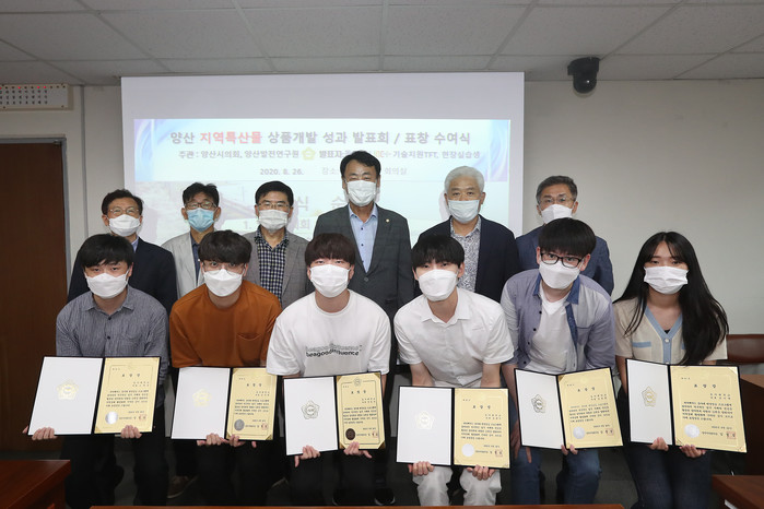 양산시의회 임정섭의장은 지난 26일 시의회 3층에서 동아대학교 LINC+ 사업단 융복합 기술지원 사업과 하계방학 현장실습을 통한 양산 지역특산물 개발 성과발표회를 개최하고 상품개발에 수고한 동아대 주성식교수와 동아대학교 재학생 화학과 4년 장동규 외 6명에 대해 표창장을 수여하였다.