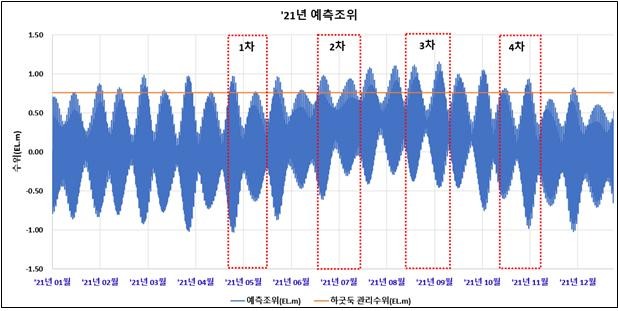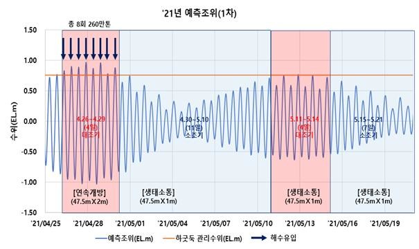 두 번째 대조기인 5월 11일부터 14일에는 바다조위가 하천수위와 비슷하거나 낮을 것으로 예측됨에 따라 적은 양의 바닷물이 유입되거나 강물이 방류될 것으로 예상된다.