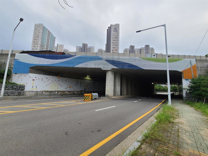 양산시는 동면 석산리 주민들의 안전한 보행 환경 조성과 쾌적하고 아름다운 도시 미관 개선을 위해 자원회수시설 인근 중앙고속도로지선 하부 터널 입면부에 알루미늄 루버를 활용한 경관 조형물 설치를 완료했다.