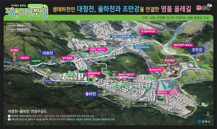 ‘장유 그린 워킹로드’는 2023년 완공을 목표로 추진 중인 조만강 생태하천 복원사업 구간과도 연계가 가능해 명품 도심 하천인 율하천, 대청천, 조만강을 잇는 김해 대표 둘레길이 될 전망이다.