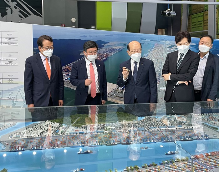 | ▲ 부산항만공사 강준석 사장(맨왼쪽)이 기획재정부 안도걸 제2차관(왼쪽 두 번째)에게 부산항 신항을 설명하고 있다. |